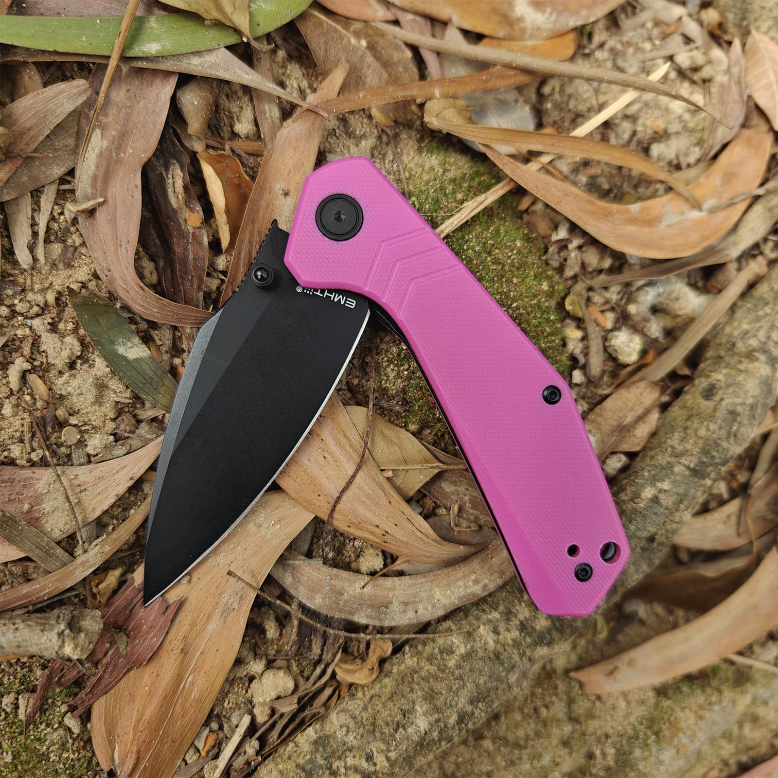 Textured G10 handle scales with purple backspacer provide comfortable hand feeling and superior grip in wet or dry conditions.